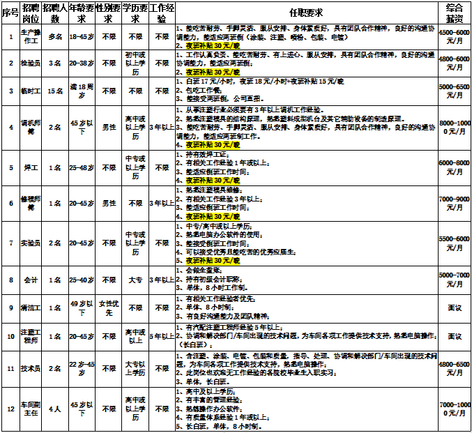 公司發(fā)展需要增加新生產(chǎn)線,現(xiàn)招聘職位如下: