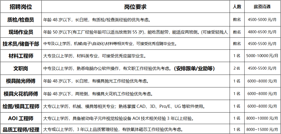 福利待遇:五險(xiǎn)一金\各類(lèi)補(bǔ)貼\培訓(xùn)\包食宿\體檢等。