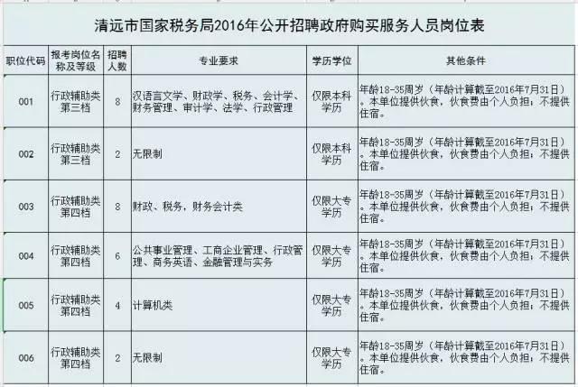 具體招聘職位和人數見《清遠市國家稅務局2016年公開招聘政府購買服務人員崗位表》(附件1)。