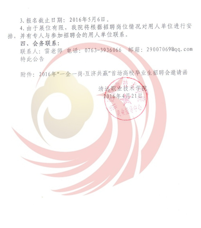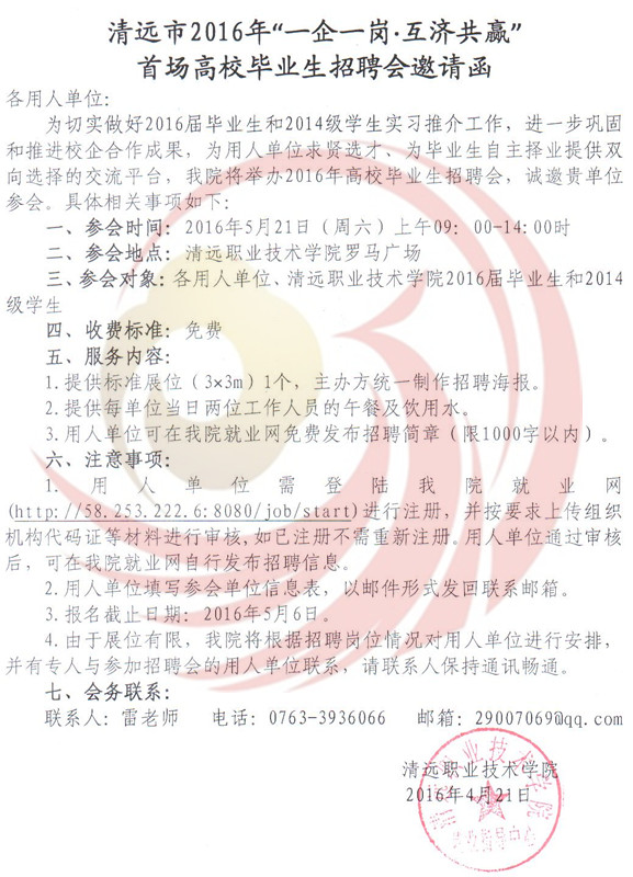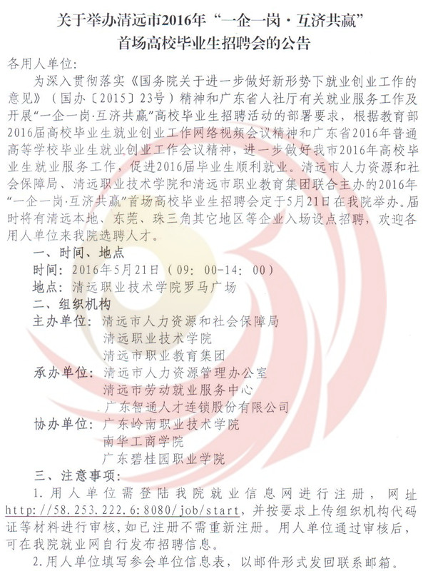 為深入貫徹落實(shí)《國務(wù)院關(guān)于進(jìn)一步做好新形勢下就業(yè)創(chuàng)業(yè)工作的意見》(國辦﹝2015﹞23號)精神和廣東省人社廳有關(guān)就業(yè)服務(wù)工作及開展“一企一崗▪互濟(jì)共贏”高校畢業(yè)生找屁活動(dòng)的部署要求,根據(jù)教育部2016屆高校畢業(yè)生就業(yè)創(chuàng)業(yè)工作網(wǎng)絡(luò)視頻會議精神和廣東省2016年普通高等學(xué)校畢業(yè)生就業(yè)創(chuàng)業(yè)工作會議精神,進(jìn)一步做好我市2016年高校畢業(yè)生就業(yè)服務(wù)工作,促進(jìn)2016屆畢業(yè)生順利就業(yè)。清遠(yuǎn)市人力資源四川和社會保障局,清遠(yuǎn)市職業(yè)技術(shù)學(xué)院和清遠(yuǎn)市職業(yè)教育集團(tuán)聯(lián)合主辦的2016年“一企一崗▪互濟(jì)共贏”首場高校畢業(yè)生招聘會定于5月21日在清遠(yuǎn)市職業(yè)技術(shù)學(xué)院舉辦,屆時(shí)將有清遠(yuǎn)本地、東莞、珠三角其他地區(qū)等企業(yè)入場設(shè)點(diǎn)招聘,歡迎各用人單位到清遠(yuǎn)市職業(yè)技術(shù)學(xué)院選聘人才。